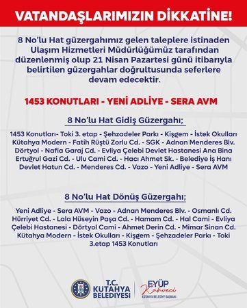 Kütahya Belediye Başkanı Eyüp Kahveci, 8 No’lu Halk Otobüsü güzergahında yapılan güncellemeyi duyurdu. Halkın talepleri doğrultusunda Kütahya Belediyesi Ulaşım Hizmetleri Müdürlüğü tarafından yapılan düzenleme, 21 Nisan Pazartesi günü itibarıyla geçerli olacak.