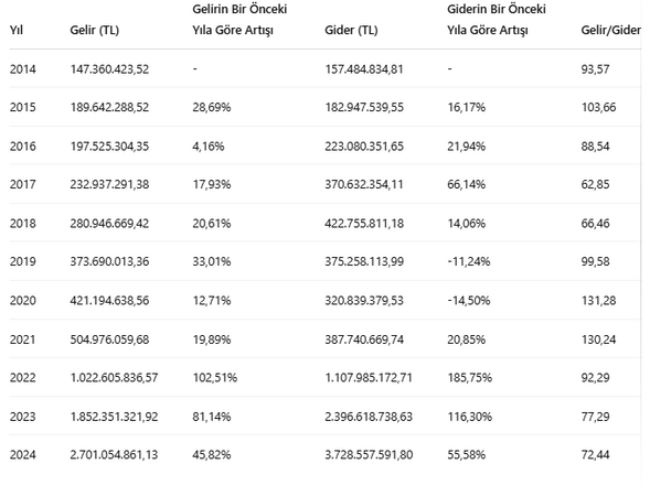 2014’te 157,48 milyon TL olan giderler, 2024 yılı itibarıyla 3,72 milyar TL’ye ulaşarak büyük bir artış gösterdi. Ancak, gelir ve gider arasındaki denge de zaman içinde değişim gösterdi. Öne çıkan bir diğer detay, gelirlerin giderleri karşılamadaki oranı. 2014 yılı itibarıyla gelir/gider oranı %93,57 iken, 2024 yılı itibarıyla bu oran %72,44’e gerilemiş durumda.