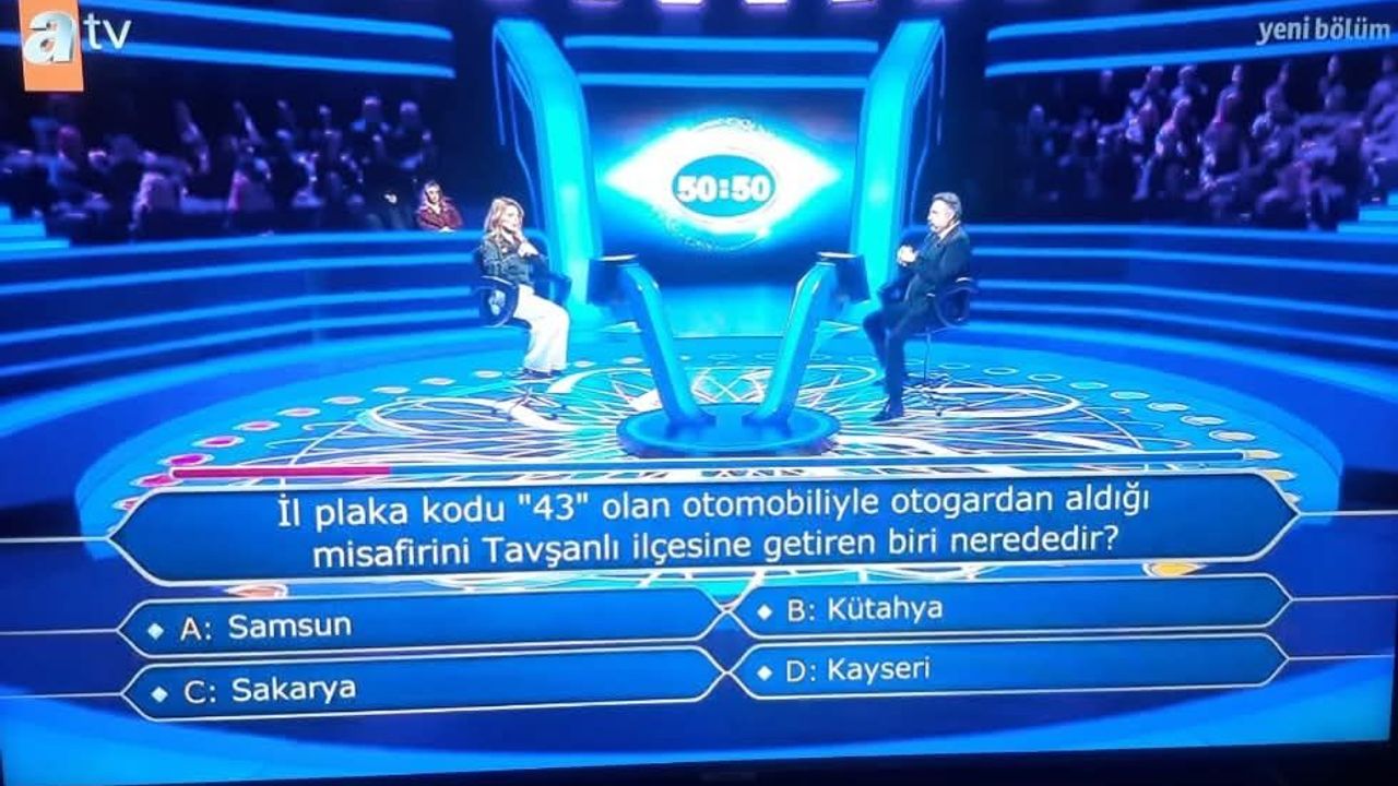Yarışmada sorulan soruda, plaka kodu üzerinden bir şehir bilgisi test edildi. Türkiye’de her ilin kendine ait plaka numarası bulunurken, yarışmacıya yöneltilen soruda özellikle Kütahya’nın plaka kodu olan 43 detayı öne çıktı.