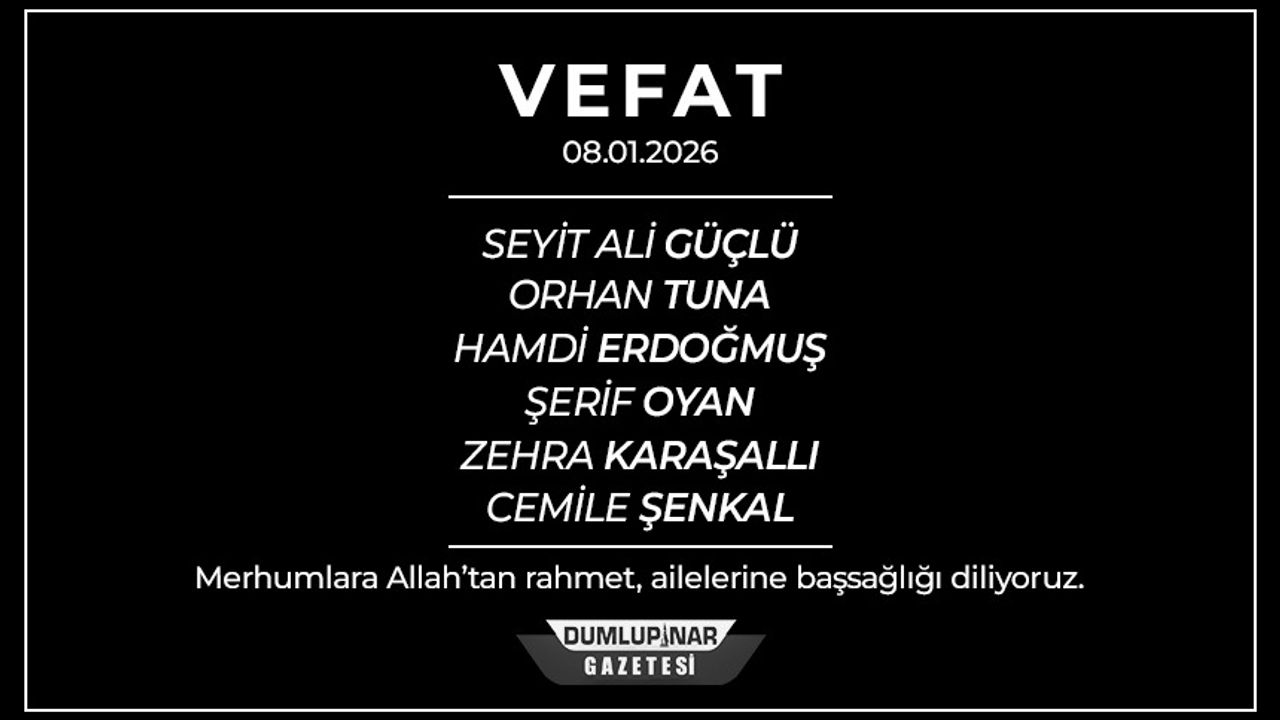 Kütahya genelinde bugün vefat eden vatandaşlarımızın cenaze bilgileri aşağıda yer almaktadır. Vefat edenlere Allah’tan rahmet, ailelerine ve yakınlarına başsağlığı diliyoruz.