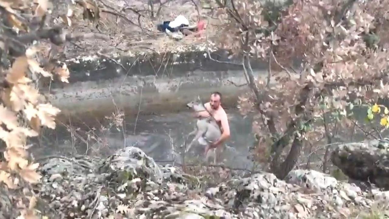 Kütahya'nın Gediz ilçesine bağlı Kayaköy'de hayvan severler, Hidroelektrik Santrali'ne su taşıyan kanala düşen karacayı yeraltı tünele girmesine 100 metre kala buz gibi suya girerek kurtardılar.
