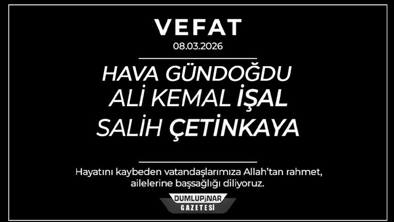 Kütahya’da 8 Mart 2026 Pazar günü vefat eden üç vatandaş için cenaze törenleri düzenlenecek. Ali Kemal İşal, Salih Çetinkaya ve Hava Gündoğdu’nun cenazeleri kılınacak namazların ardından toprağa verilecek.