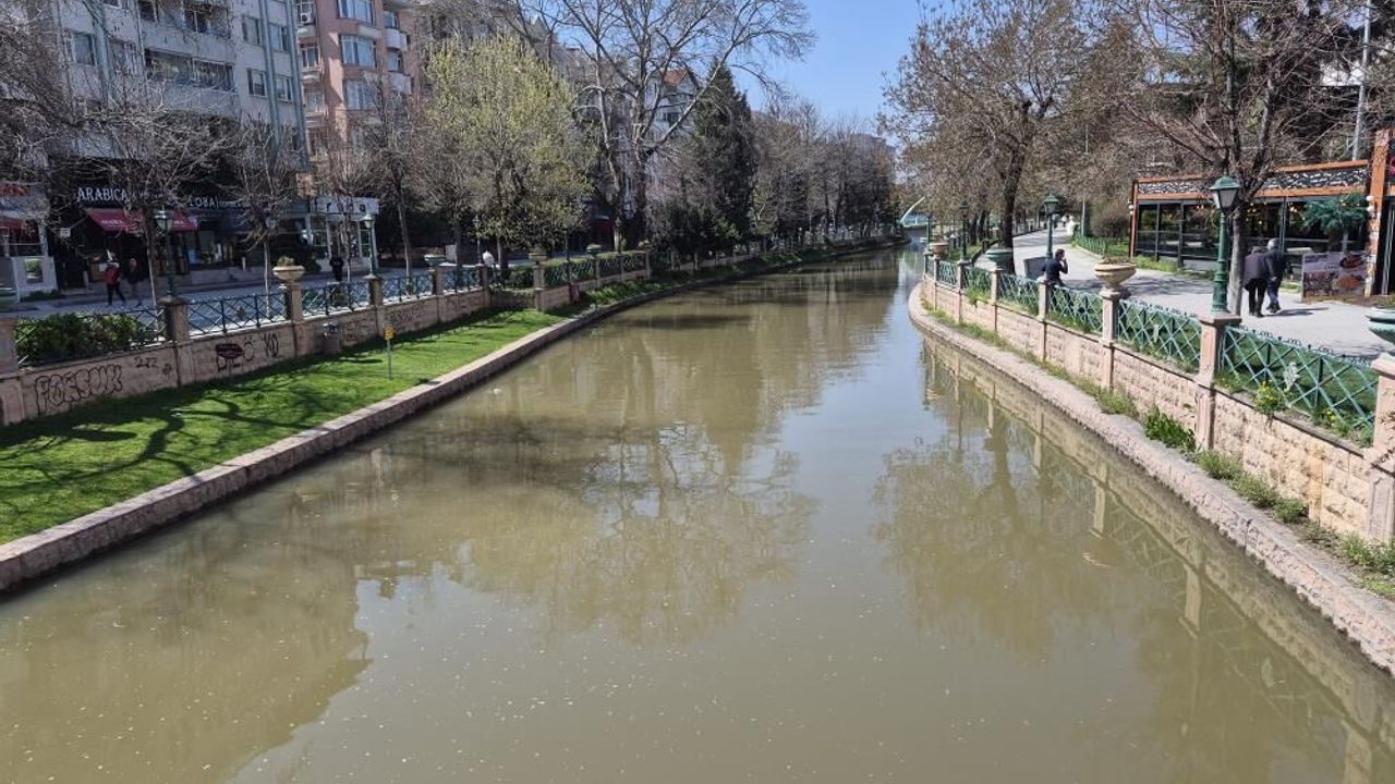 Eskişehir’de yağış sonrası kahverengi tonuna bürünen Porsuk Çayı ilginç görüntü oluşturdu.